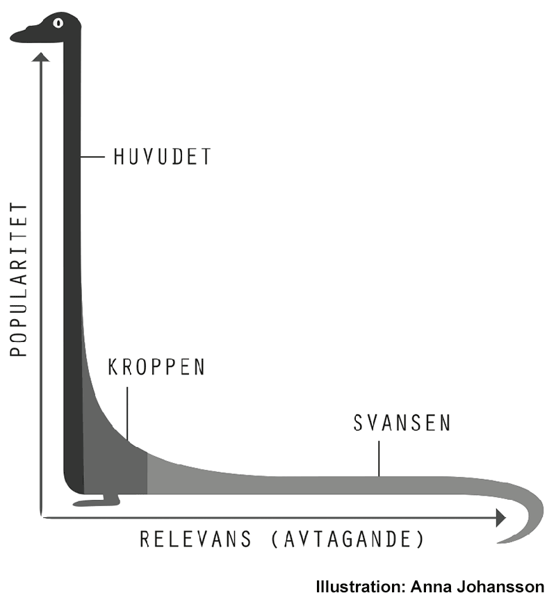 Bilden här intill illustrerar något med många namn, nämligen long-tail, Zipf-kurva, eller 80/20-regeln. Gemensam nämnare är att den stora massan av oss ganska ofta kommer ställa en sökfråga som är väldigt vanligt förekommande.