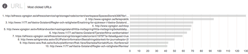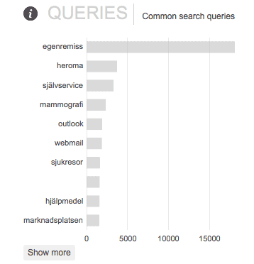 Mest intressant med sökanalys är nog listan över de vanligast ställda sökfrågorna, se bild intill för VGR. Inte helt oväntat är våra användare ute efter information som har med vård att göra, nämligen ’egenremiss’. Strax under kommer ’heroma’ vilket är namnet på vårt personalsystem, platsen där vi ansöker om semester, rättar tidrapporter med mera.