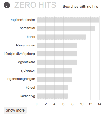 Kanske det enklaste inom sökanalys, och för en sökredaktör att ta tag i, är när användaren söker på något men inte får några träffar. Det är i de flesta fall ett fatalt misslyckande och en ovillighet till samhälllsservice i vårt fall. Ibland kan det vara så att någon söker efter något som inte har med oss att göra. Exempelvis är det vanligt att folk tror att Länsstyrelsen för Västra Götaland och Västra Götalandsregionen är samma organisation. Men samtidigt, vem kan klandra dem? Det är ju inte top-of-mind för våra medborgare att ha stenkoll på alla delar av offentlig sektor, även fast vi kan tycka att de borde komma ihåg mer samhällskunskap (men så bildades ju VGR efter majoriteten av våra medborgare gick ut ur skolan…).