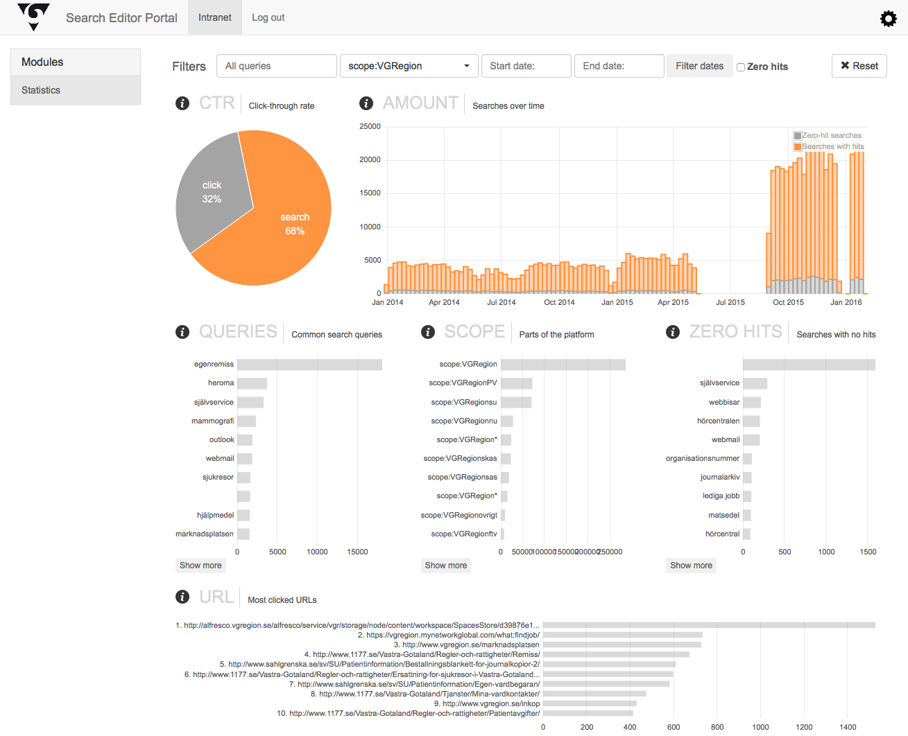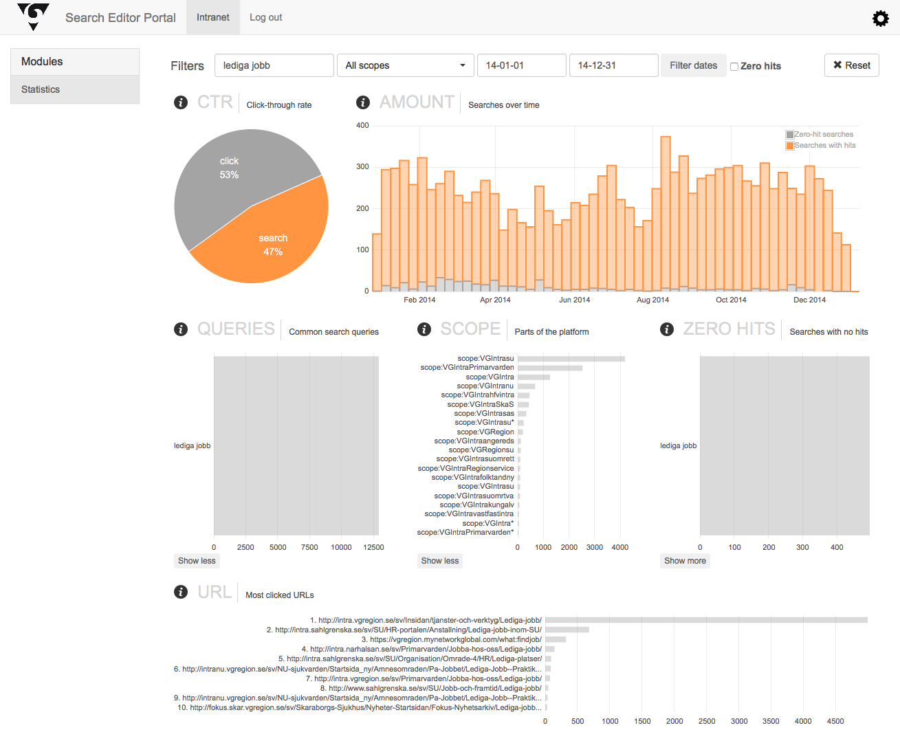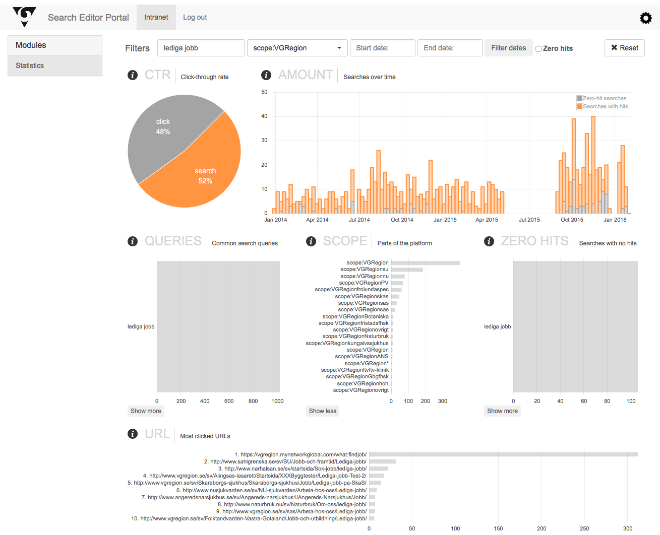Vi är i slutfasen att skruva in det regionala verktyget för att jobba med sökanalys. Vi är inte helt på det klara vad vi ska kalla det för ännu, men det lutar åt ’sökredaktörsportal’. Det kan finnas en poäng i detta namn då man ibland anar att kollegor tror att sökmotorn är en magisk IT-lösning som kan förädla det innehåll den hittar och presentera det innehåll som är relevant för oss när vi söker.